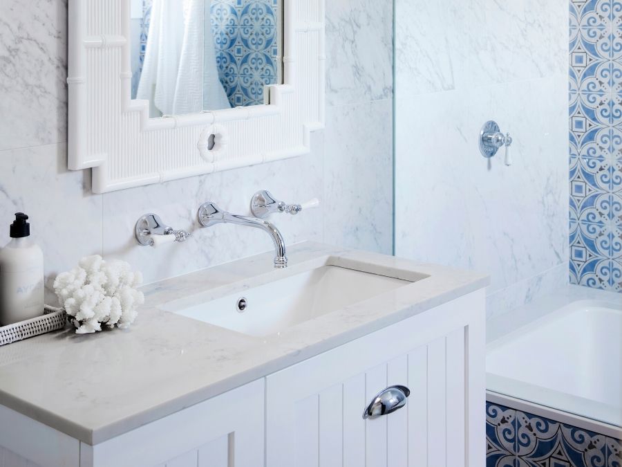 Shaker style cabinets often with a solid marble vanity top, such as this vanity link to marble top vanity on tile republic website marble feature tiles link to marble feature tiles on tile republic website ornate tapware;